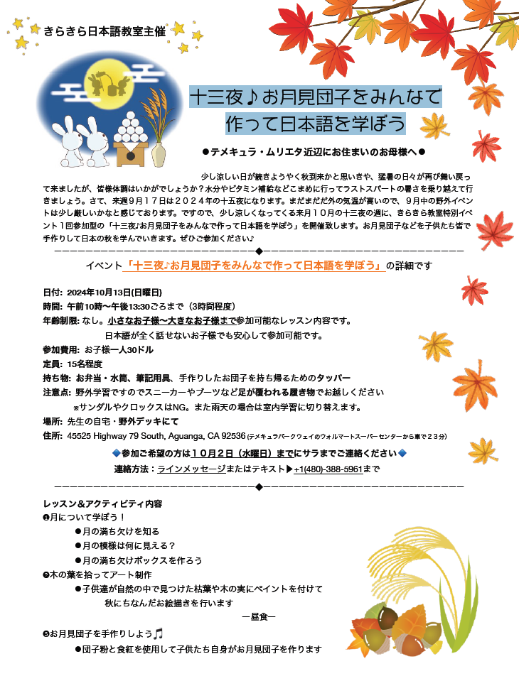 お月見団子などを子供たち皆で手作りして日本の秋を学んでいきます。ぜひご参加ください!