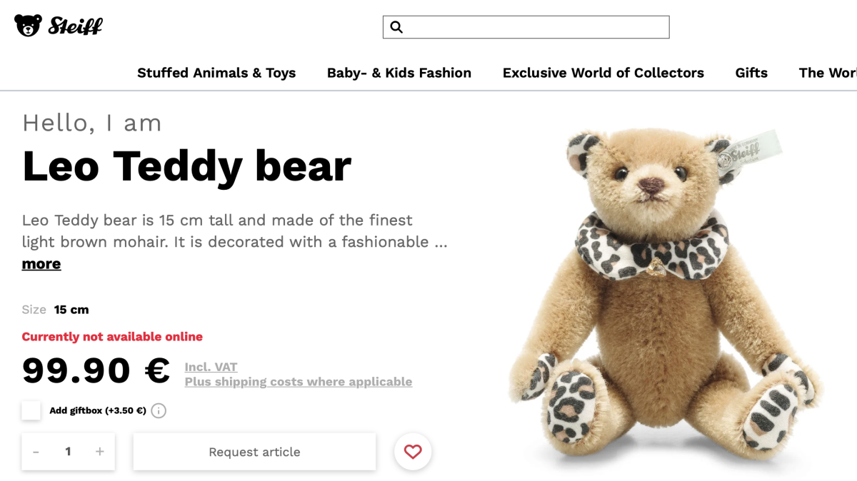 プレゼントでいただいたものの、興味がないので、可愛がって頂ける方にお譲りしたいです。新品タグ付きです。詳細はSteiffのオフィシャルサイトのスクリーンショットをご参照ください。