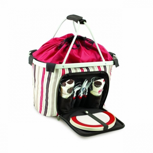 シンプルですが、しっかりした作りのフォーク、スプーン、ナイフ、プラスチック皿、コップ、ナプキンが4組ずつ備え付けのピクニックバスケットです。