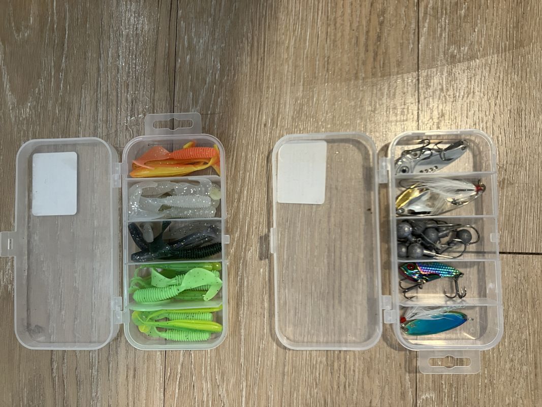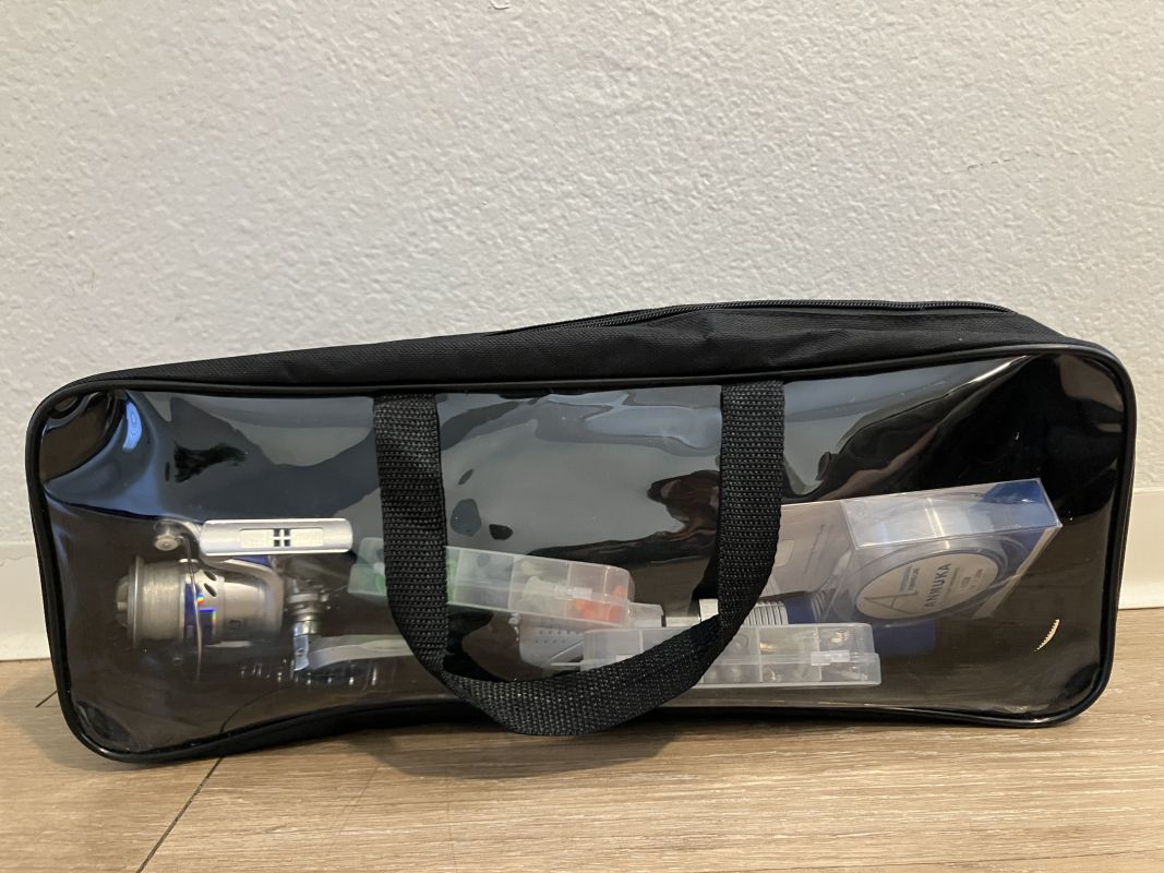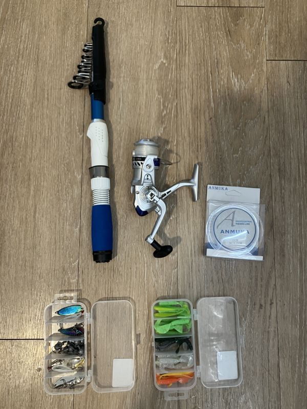 釣りセット(釣竿1本、糸、ダミールアー2箱)ケース付きです。