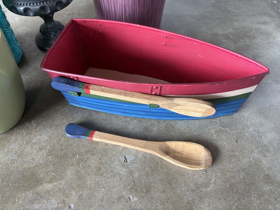 船の形をした植木鉢は使っていません。飾りのオールは両サイドにあり取り外し可能。