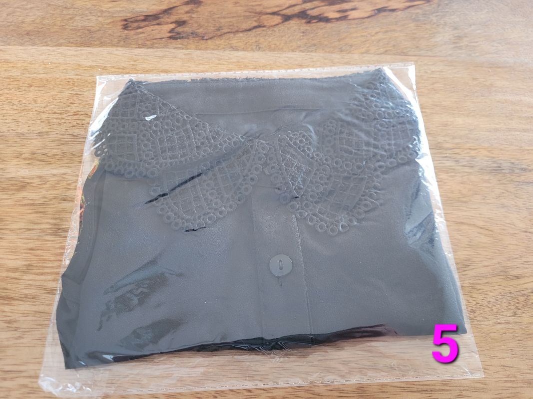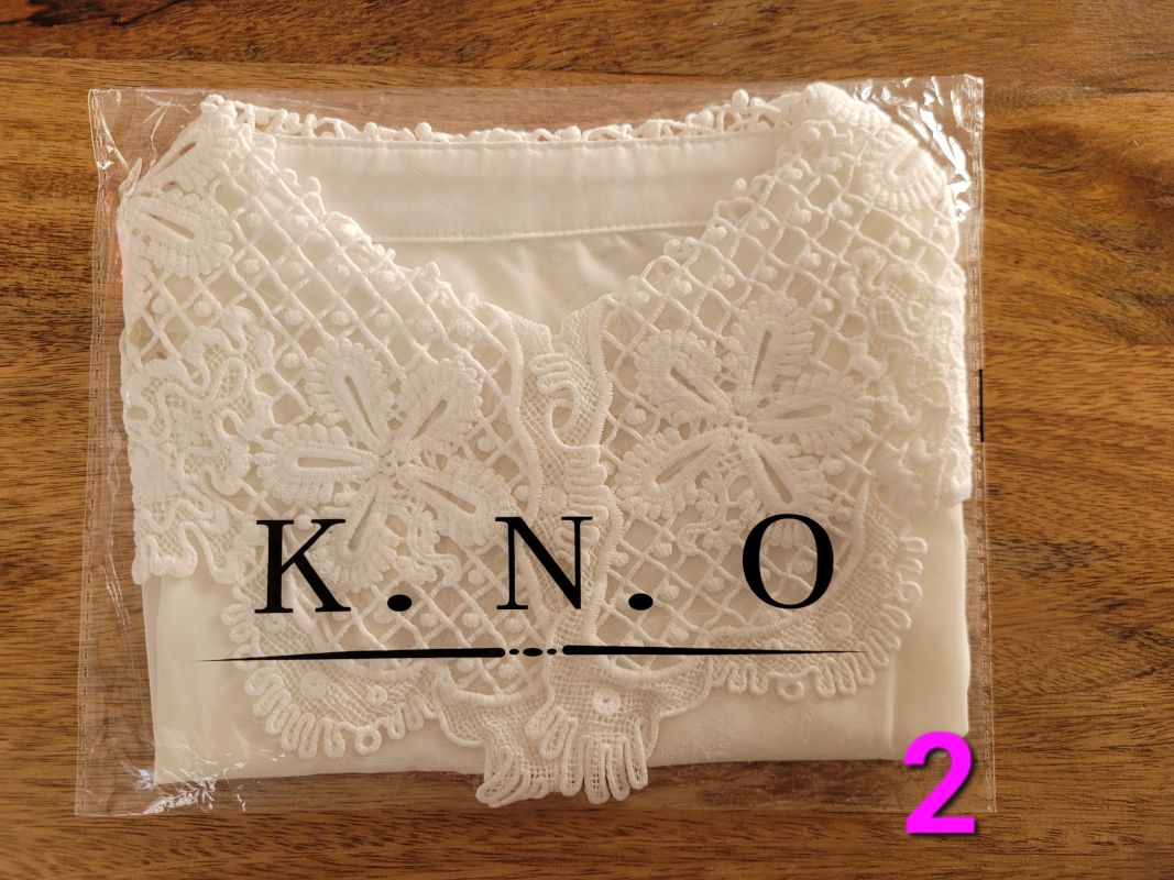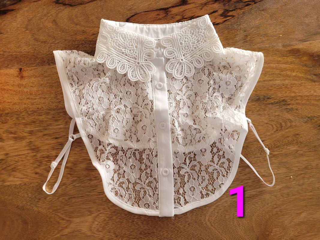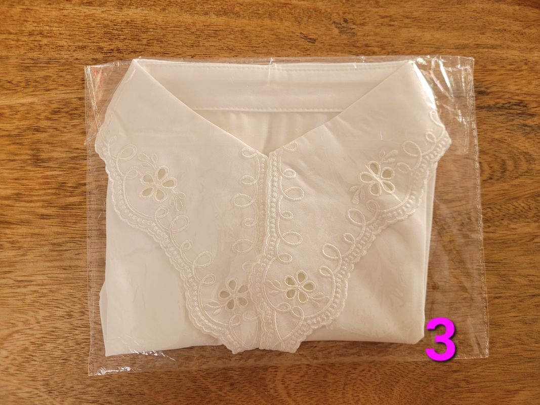 レースつけ襟。写真掲載のために袋から出したものもありますが、全て新品未使用です。すべで紙の化粧袋に入った状態で保管してあります。各10ドル。