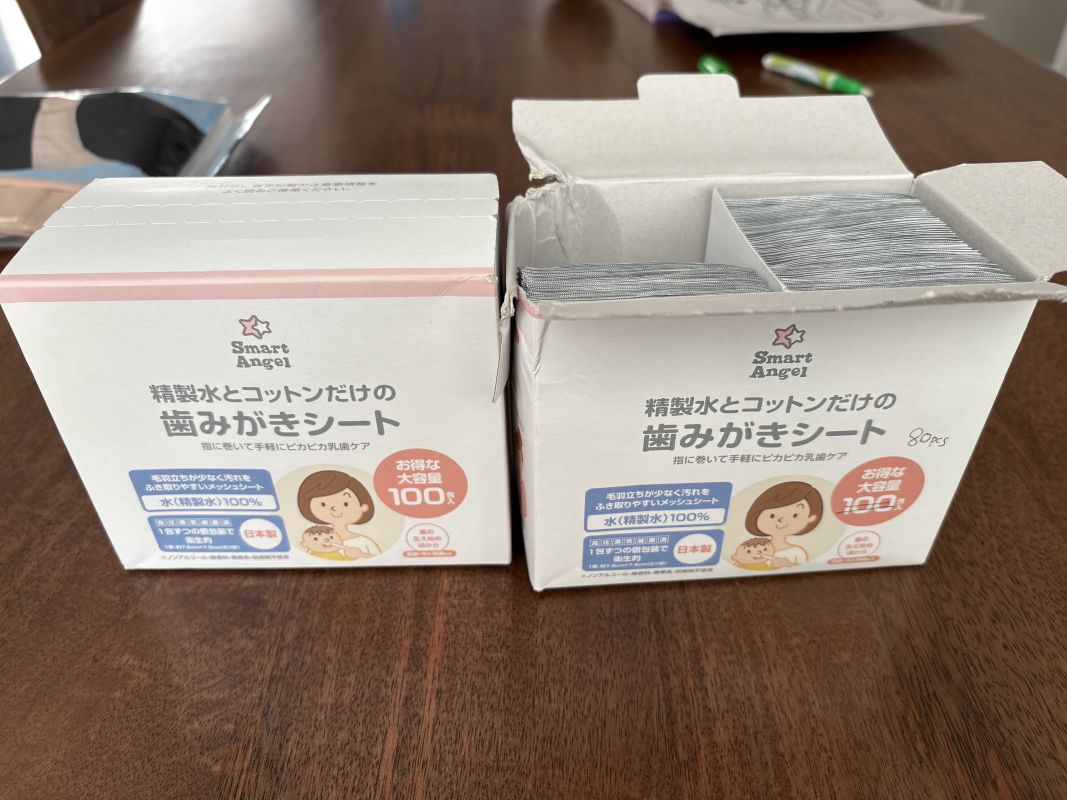 今年6月に西松屋で購入した歯磨きシート、二箱あります。一箱は開封してますが、80枚残ってます。