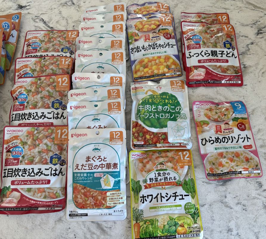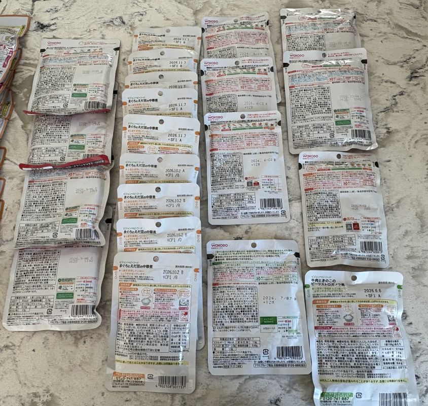 今年6月に日本で購入して持って来た離乳食パウチが沢山あるので、1つ$2でお譲り希望してます。賞味期限は、全て2026年6月以降です。詳しくは、添付写真をご確認お願いします。