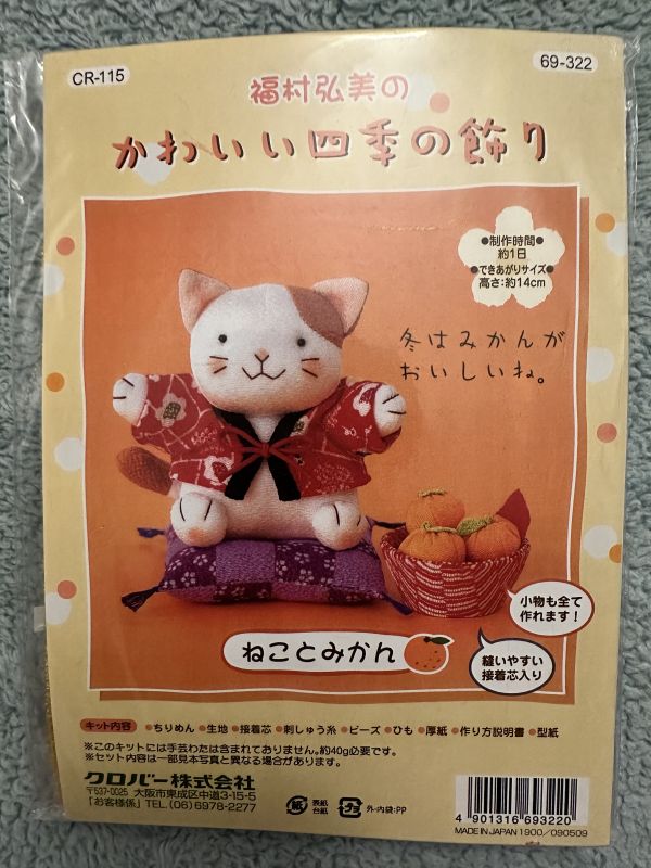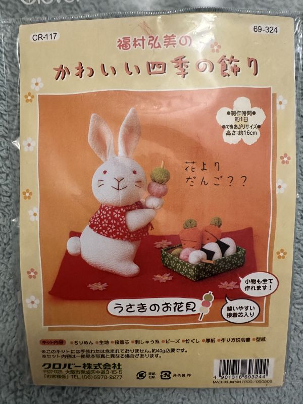 開運招き猫、かわいい四季の飾りーウサギのお花見、ねことみかんの三点で各5ドルです。