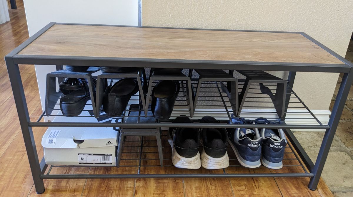 丈夫なラックです。天板に座って靴を履くことができます。収納量が増えるオーガナイザー(写真に写っているグレーのもの)もお付けします。