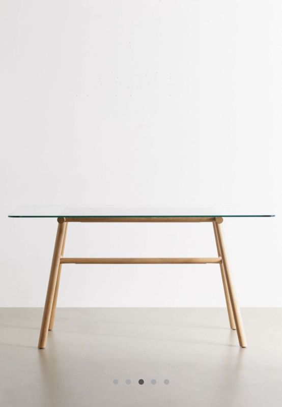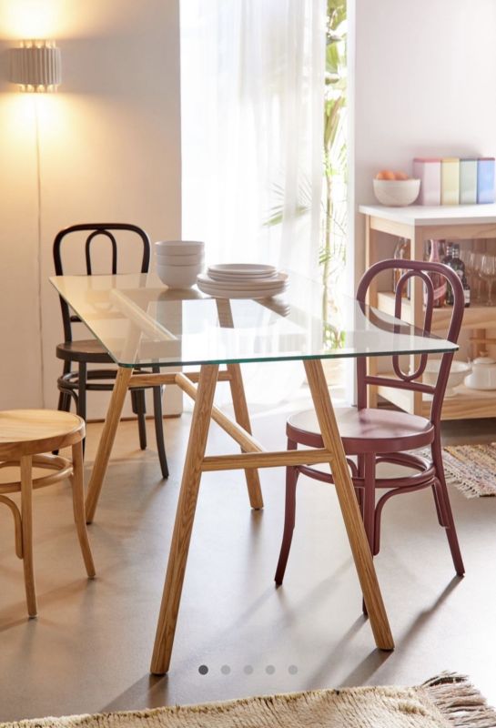 Features - Mid-century modern dining table from UO Home - Glass tabletop with a natural-finished ash wood base - Assembly required - UO exclusive