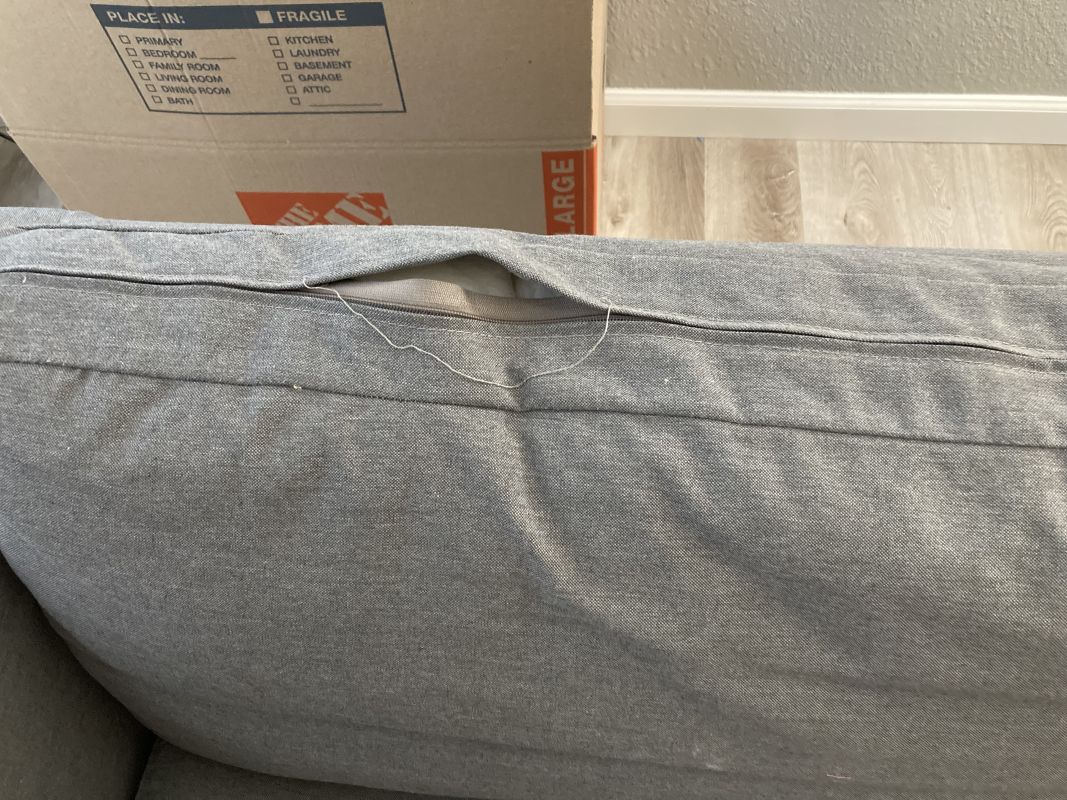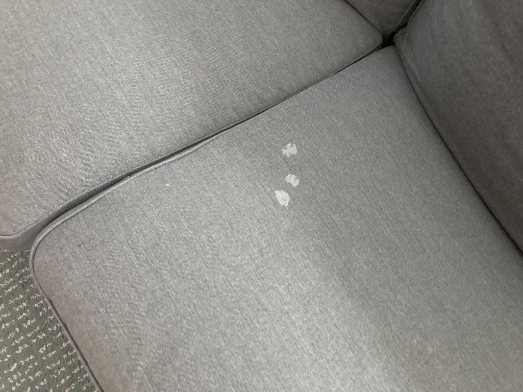 IKEAのPARUPというソファです。$599で買って2年使用。目立った汚れ①スライムの染み②小さな穴③ファスナー破れがありますが、IKEAで替カバーを買えば、ほぼ新品同様に使えます。