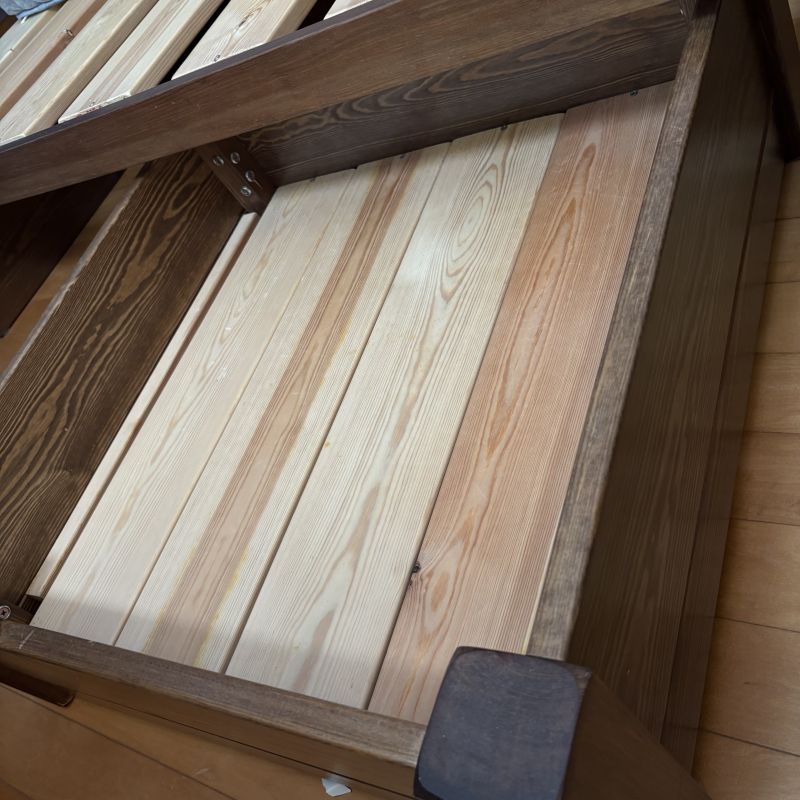 木製のベッドフレームには下に収納箱2個付いています。