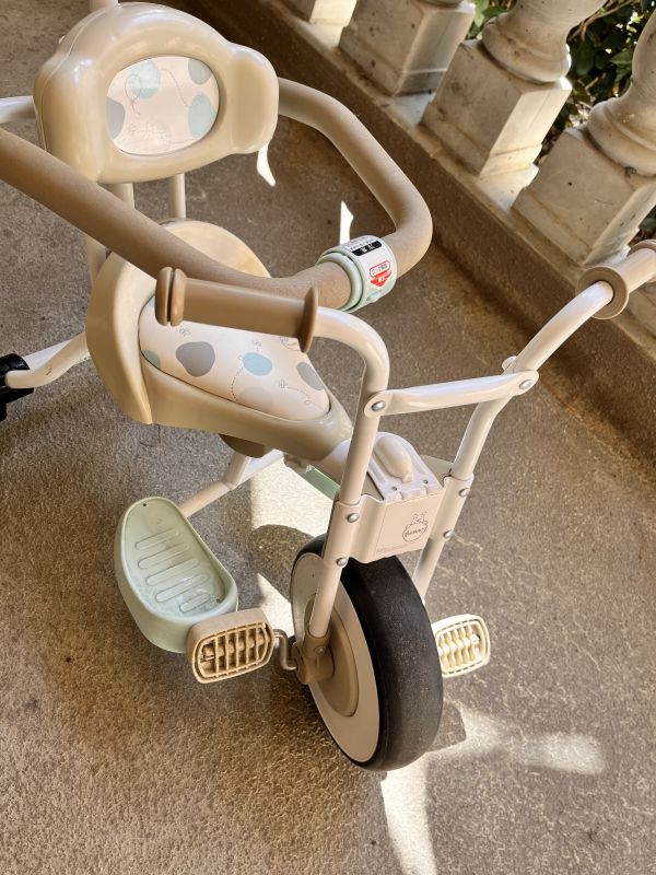 1から3歳向けの三輪車になります。パーツを外せば、4歳まで使用できるようです。自宅のバルコニーで保管しており、皮部分やタイヤのヒビなどがあります。