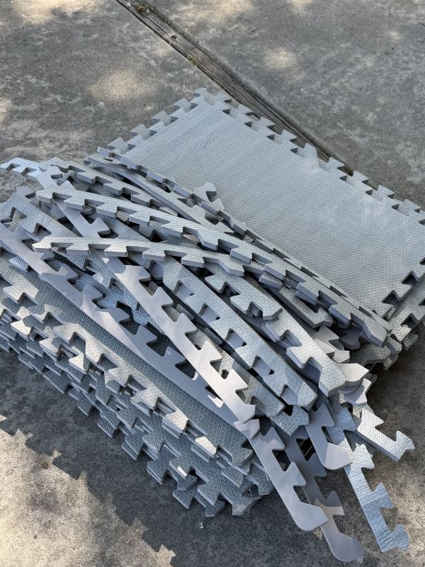 グレーの木目柄のフィームタイルです。4セットほどあり、コーナーピースも全て揃っていて未使用のものも沢山あります。ただ、子供がタイルに鉛筆などで穴を開けてしまった跡がある(写真参照)ので無料でお譲りします。