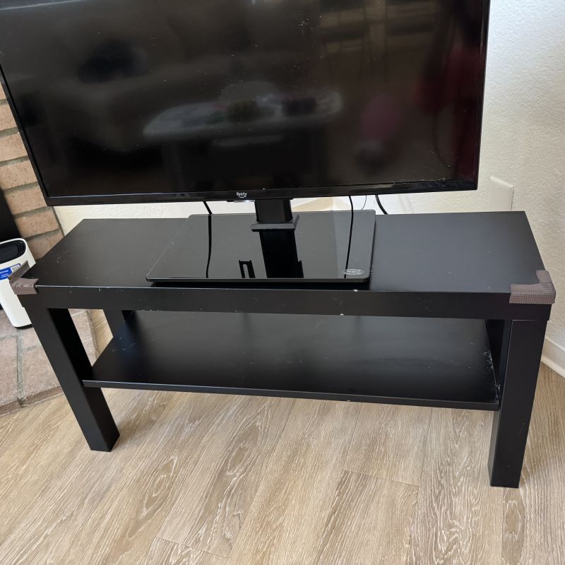 • テレビ台: 黒のシンプルなラック。26×90×45 cm