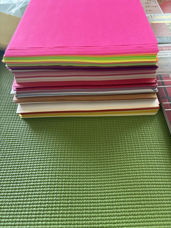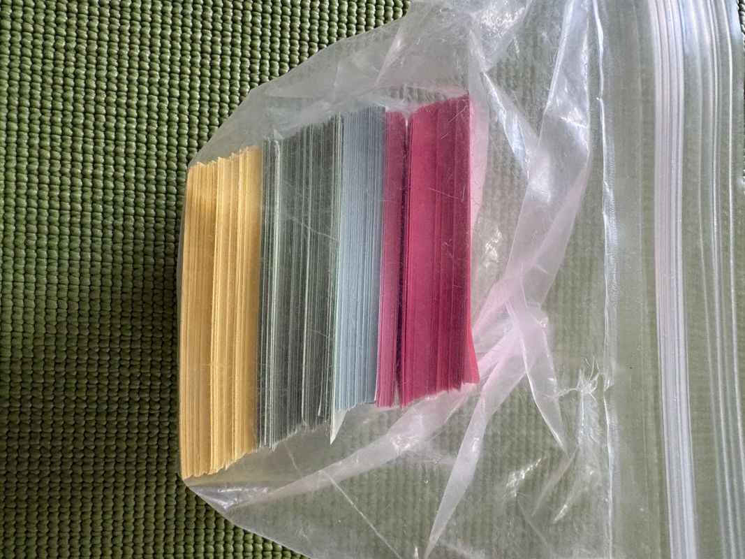 またサイズの小さいカラー用紙4色も無料です。厚さ6cmちょっとありますので400枚前後あるかと思います。写真を参考になさってください。