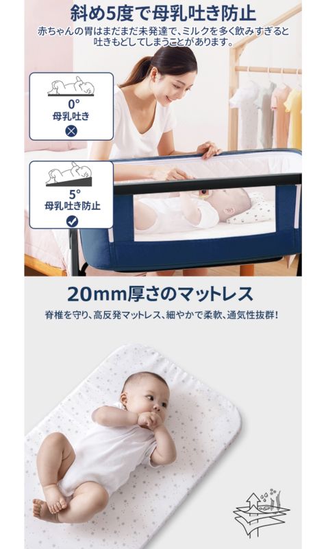 ・ベッドを傾けることができるので、新生児の頃はミルクを吐くのを防ぐことができました。